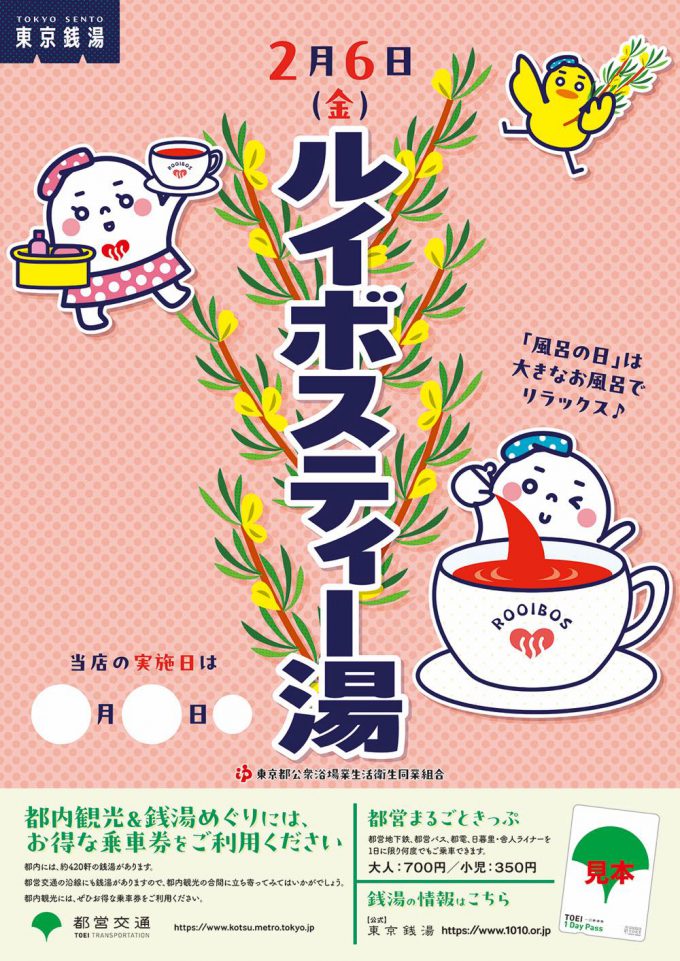 杉並区内の銭湯では、2月6日(金)「お風呂の日」に「ルイボスティー湯」を実施します。
