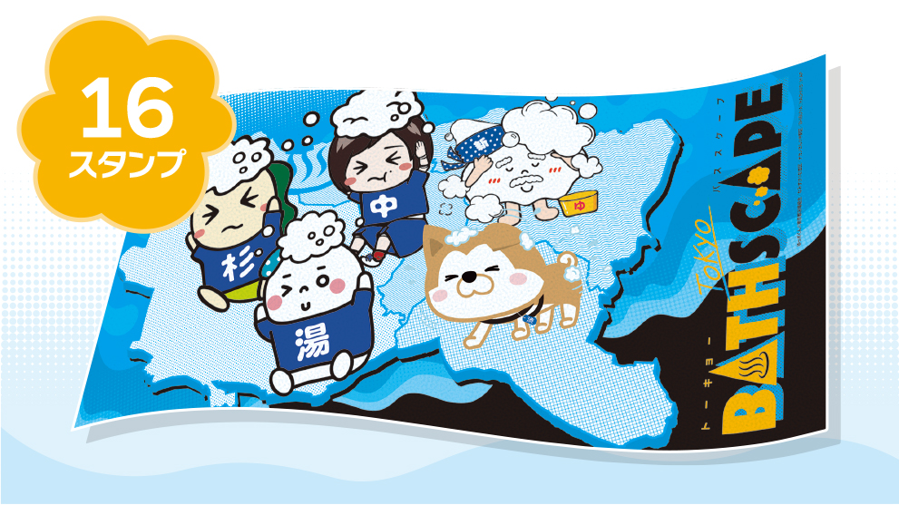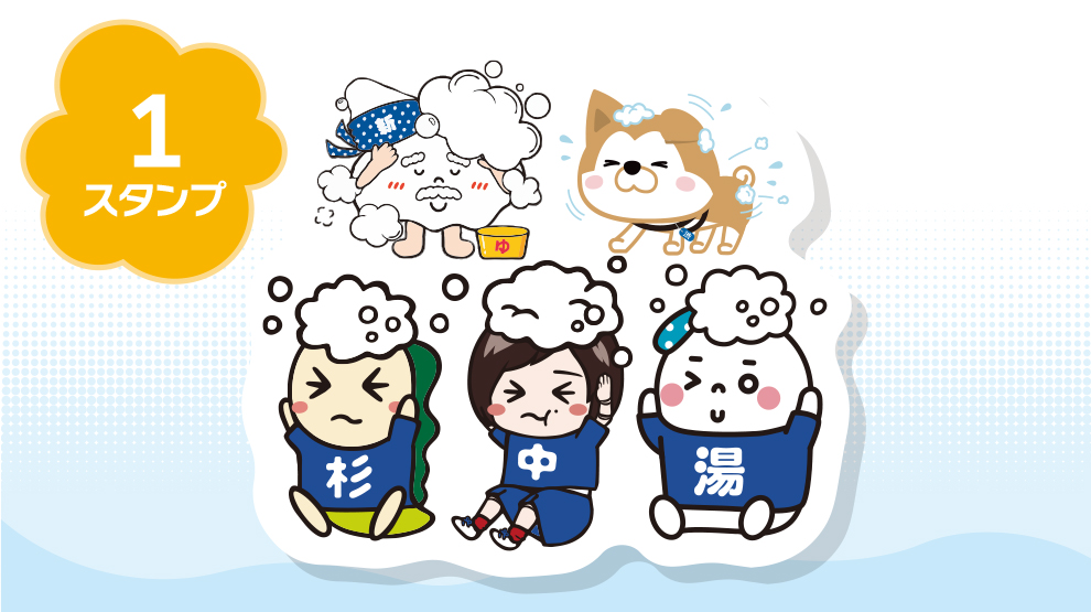 杉並、中野、新宿、渋谷の銭湯を巡り、お手持ちのスマートフォンでQRコードをスキャンして集めたスタンプ数に応じて、杉並区公式アニメキャラクター「なみすけ」、中野区シティプロモーションキャラクター「ナカノさん」、新宿浴場組合公式キャラクター「ゆげじい」、渋谷区観光協会公式キャラクター「SHIBUYA♡HACHI」、東京都浴場組合公式キャラクター「ゆっポくん」のコラボグッズをプレゼント!!